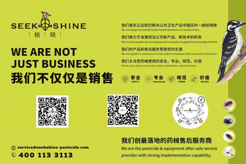 SEEKSHINE is an authorized distributor in China for internationally renowned pest management products from BASF, Syngenta, Alcochem, and others. In addition to supplying high-quality pest control tools and chemicals, we offer customised solutions, pest risk assessments, and specialised training services.