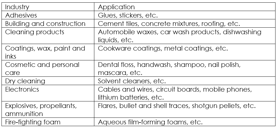 The uses of PFAS are exceptionally broad and an excellent review considered 25 broad industries and applications, some of which are summarised in Table 1.